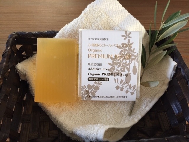 手作り釜焚き無添加石鹸 Organic PREMIUM 純石鹸 130gバス用ジャンボサイズ 『3種の未精製 ゴールドオイル配合』 3種類の有機栽培ゴールドオイルをたっぷり配合したプレミアム処方です 送料無料 天使の石鹸
