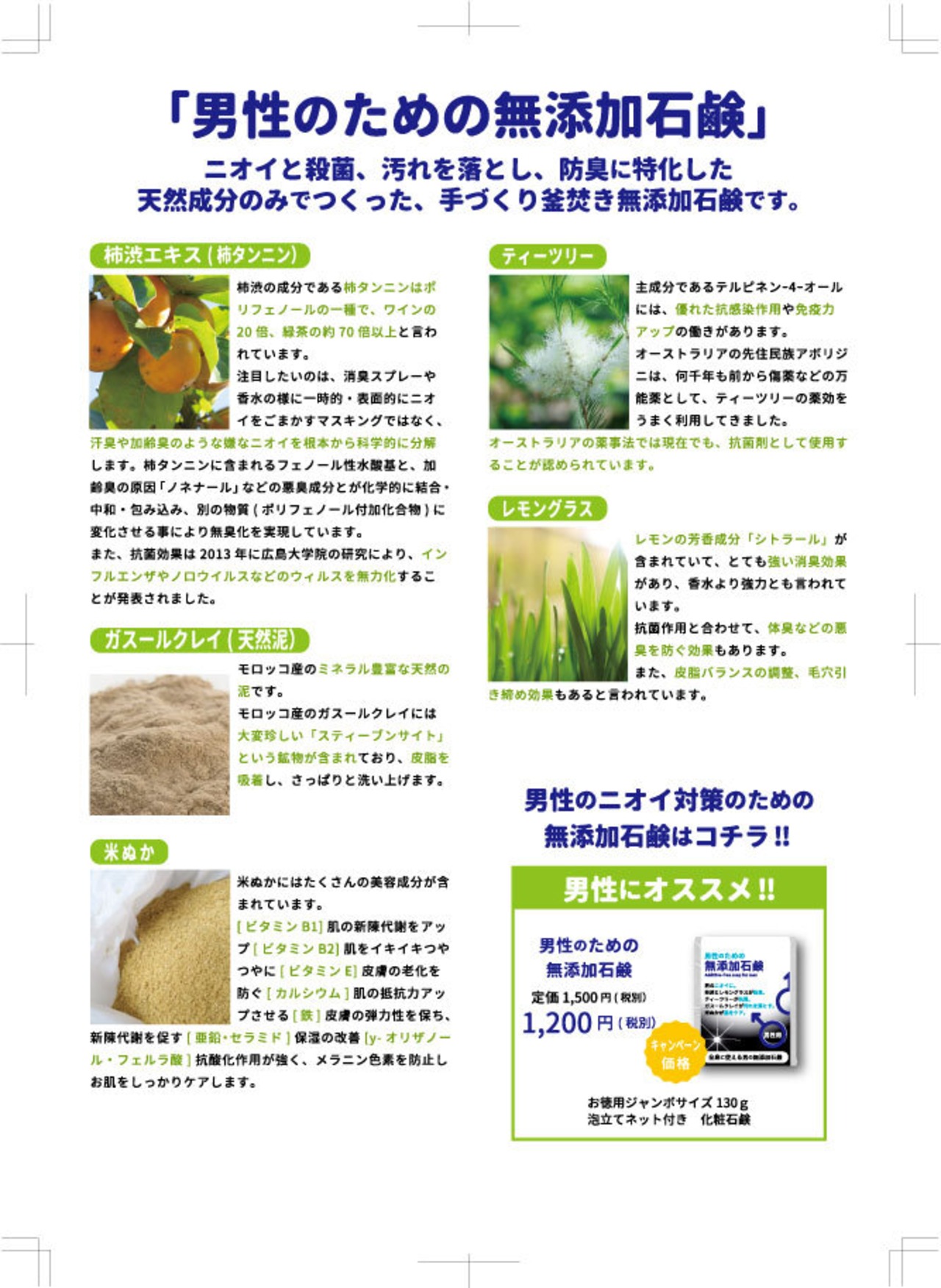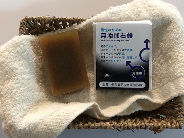 「男性のための無添加石鹸」はニオイと殺菌、汚れを落とし防臭に特化した天然成分のみでつくった手づくり釜焚き無添加石鹸です。